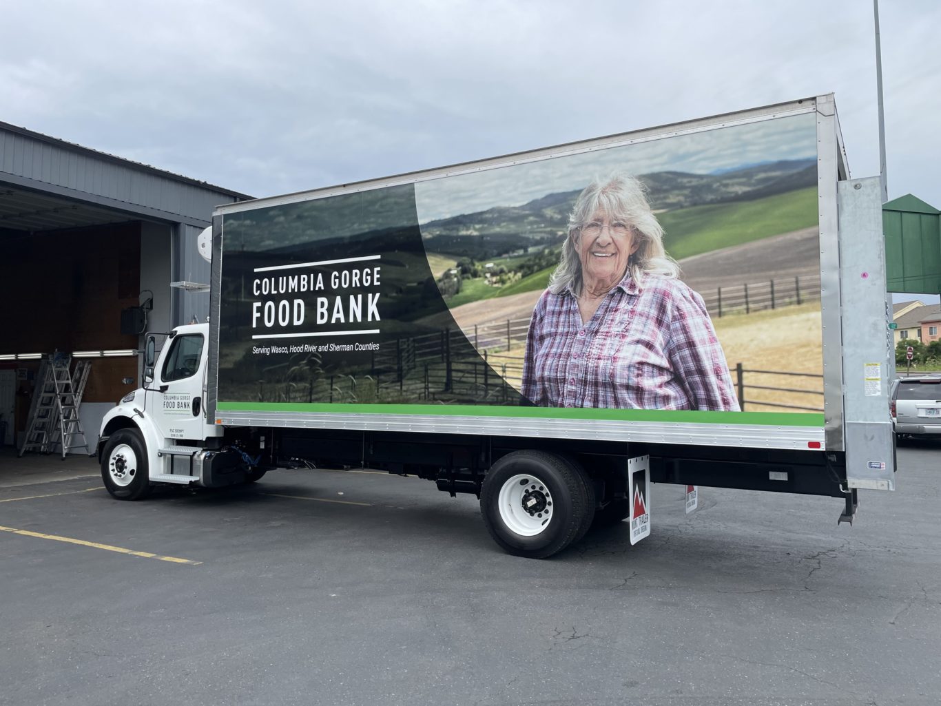 The truck features photos of Gorge scenery and longtime Windy River Gleaners volunteer and beloved community member, Virginia McKay, in celebration of her labor and all of the community partners who make our work possible.